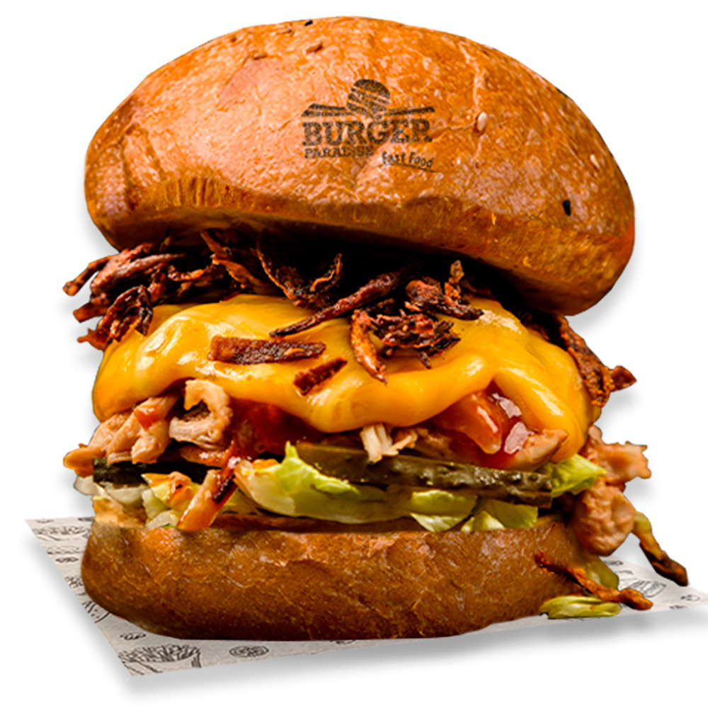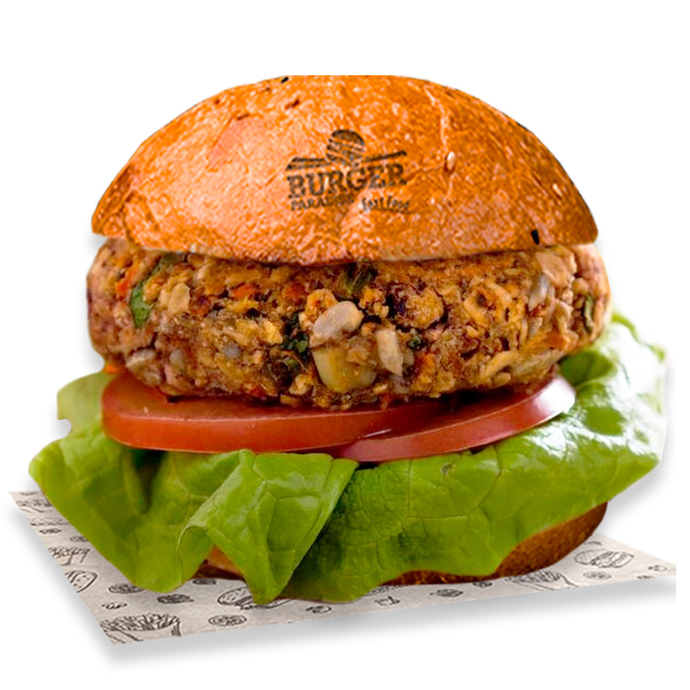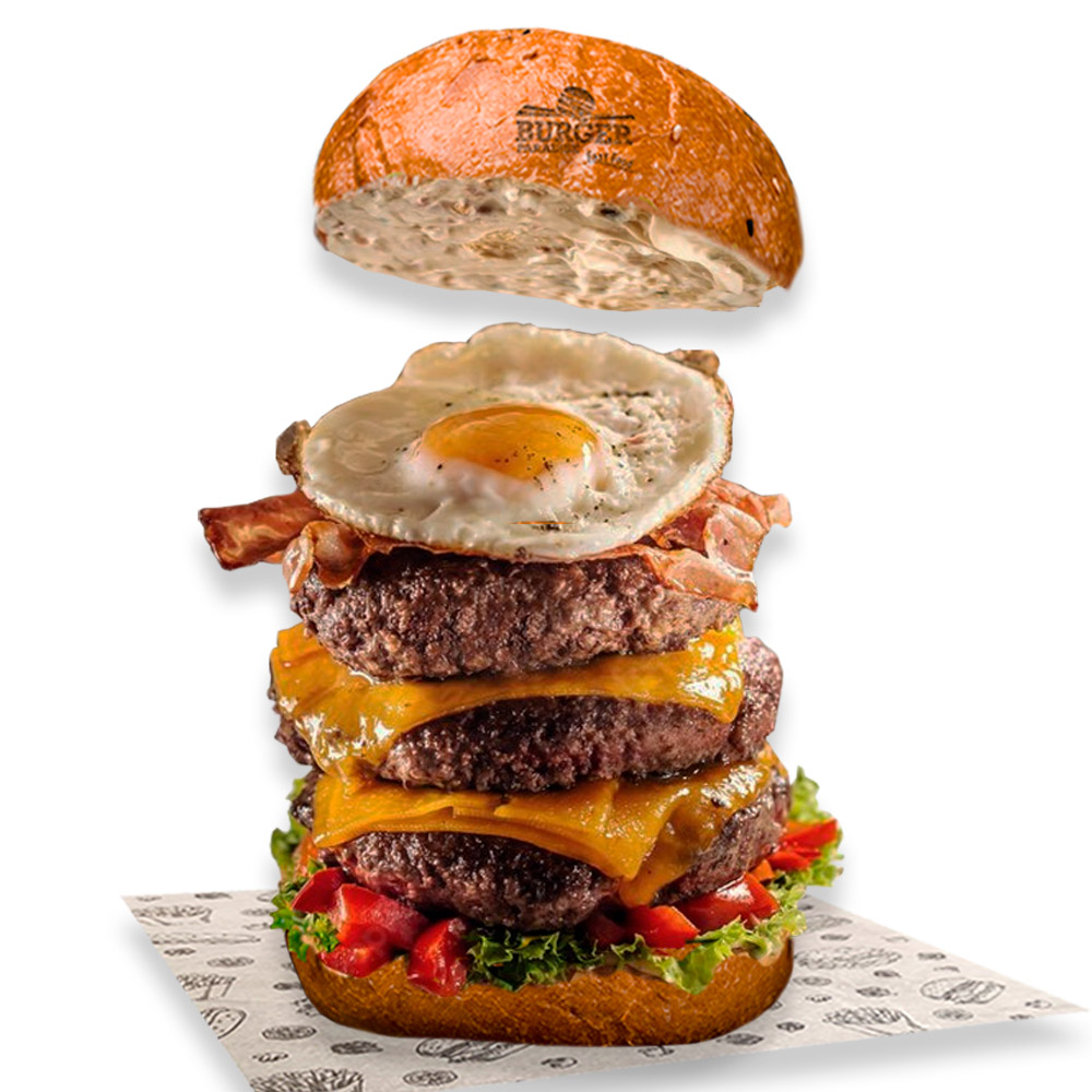 Hamburguesa con triple carne a la parrila acompañada con tocino, queso, huevo frito, pimenton asado y vegetales.