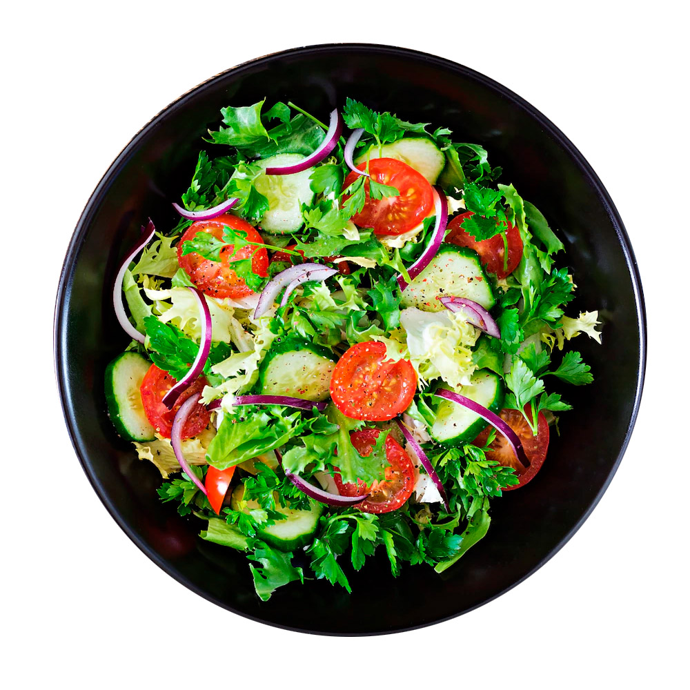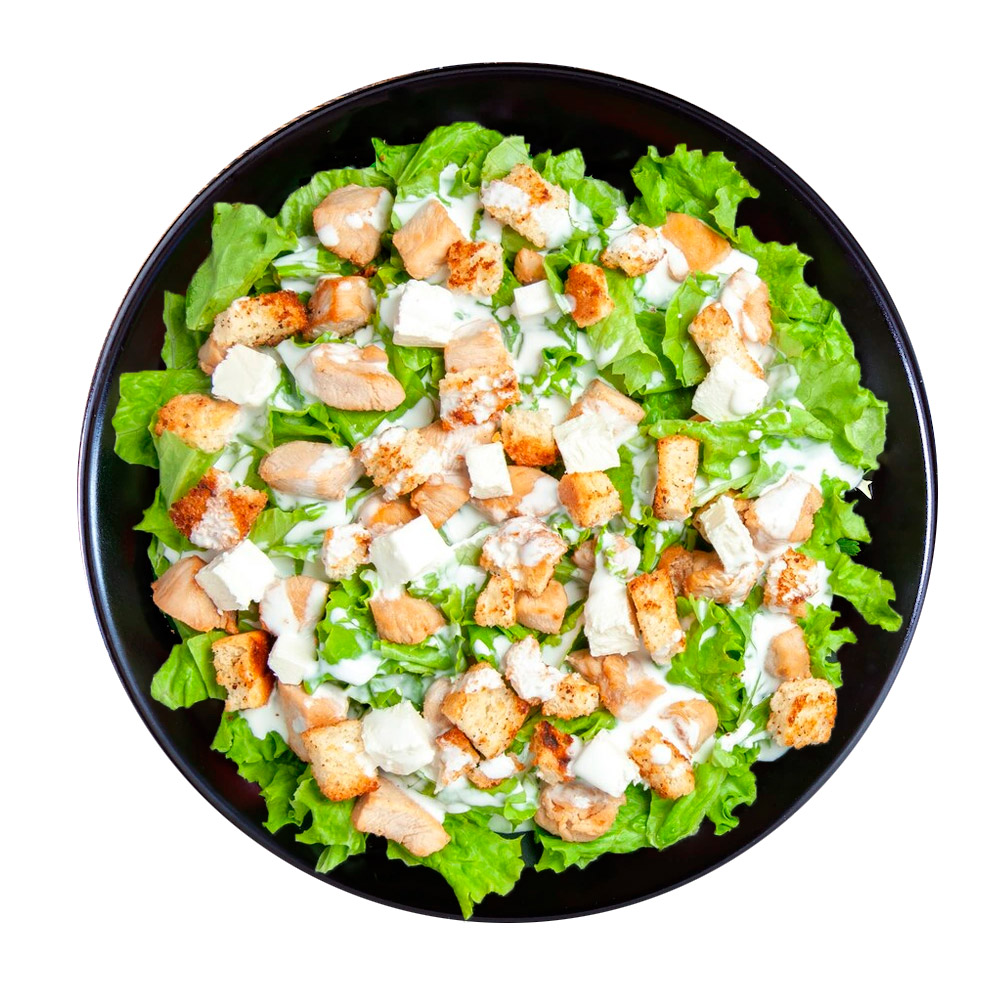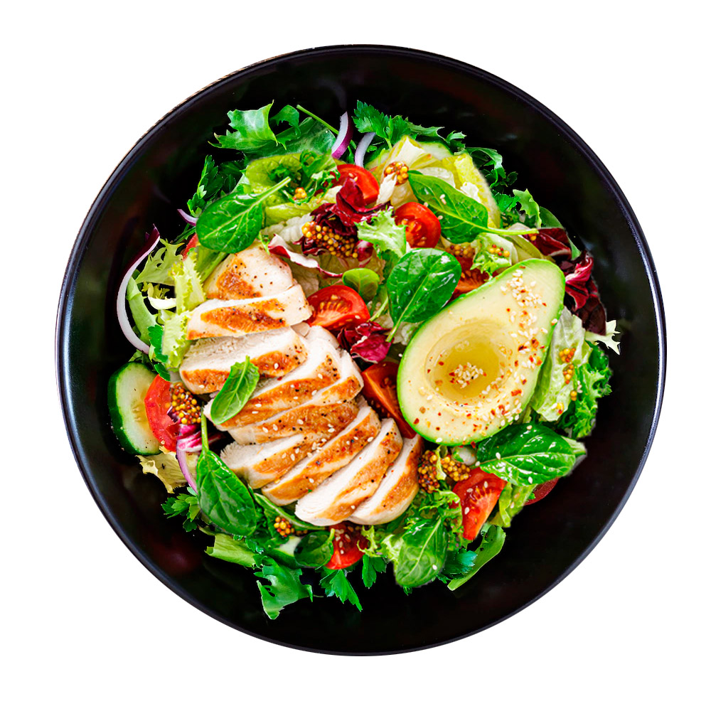 Ensalada de pollo a la plancha con verduras frescas de tomate, aguacate, lechuga y espinacas