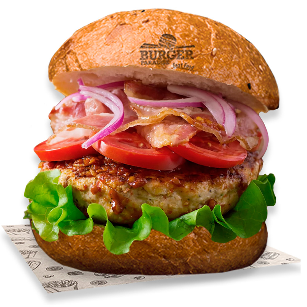 Harburgues de pollo con tocino bañada en salsa BBQ y vegetales